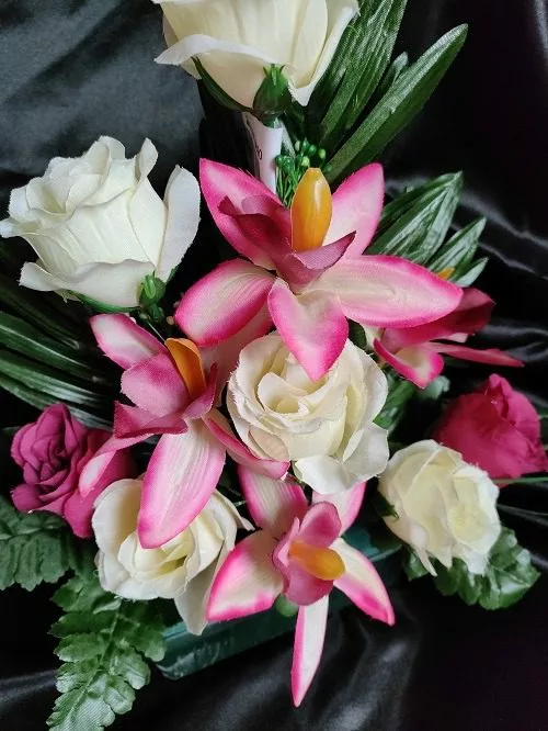 – Jardinière avec des orchidées, des roses de couleur blanc & fushia Hauteur 36 cm Largeur 32 cm