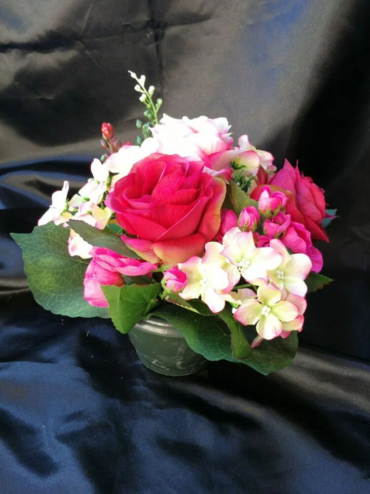 Composition de Fleurs Artificielles Lesté Ciment, pour une parfaite tenue à l’ extérieur.