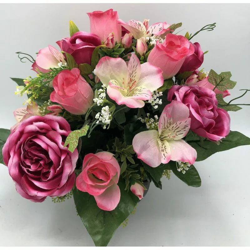 – Coupe lesté ronde, fleurs variées, roses – altromérias et feuillages artificiels en tissus variées.